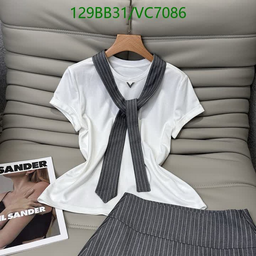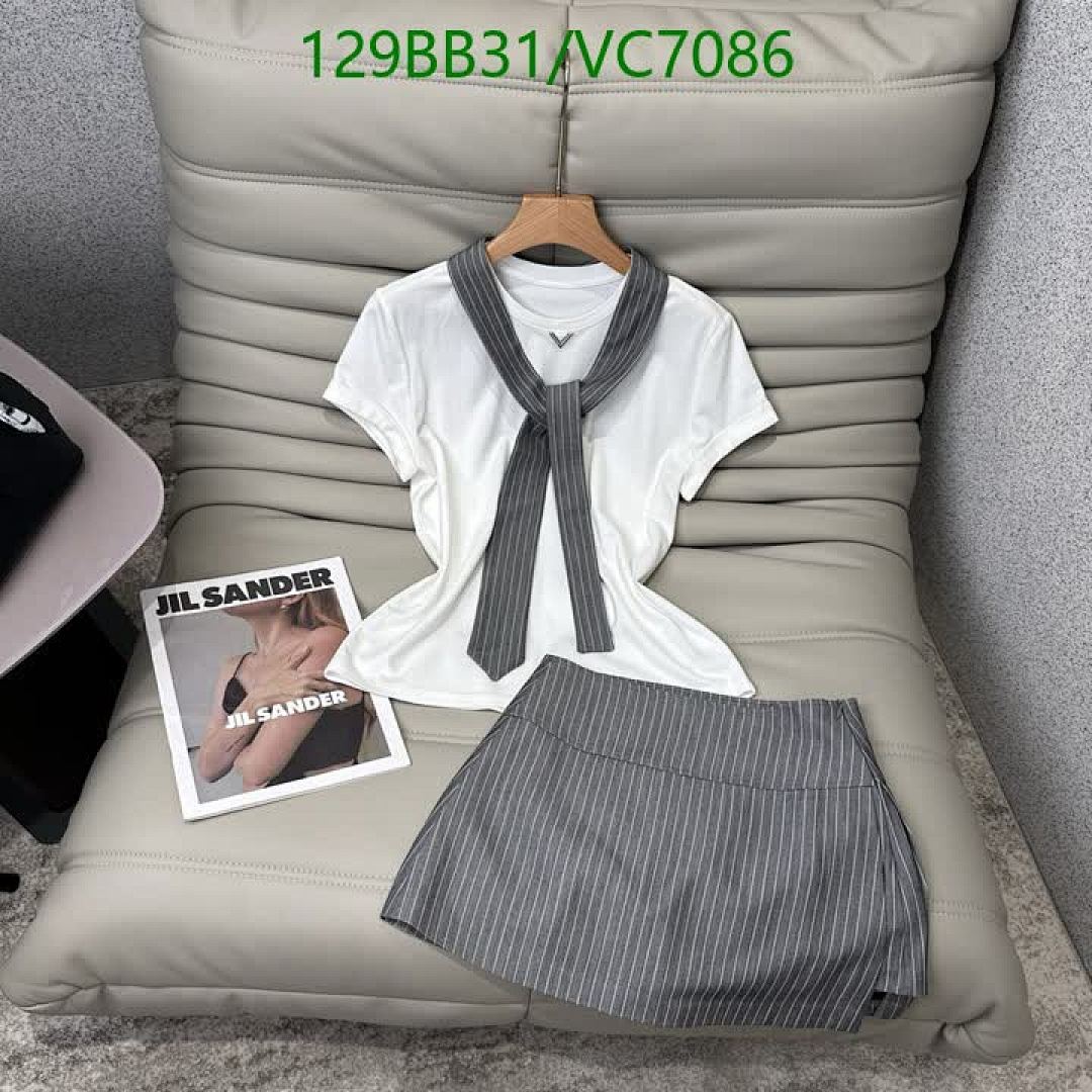 - Color: White (T-shirt), Grey with White Stripes (Skirt)