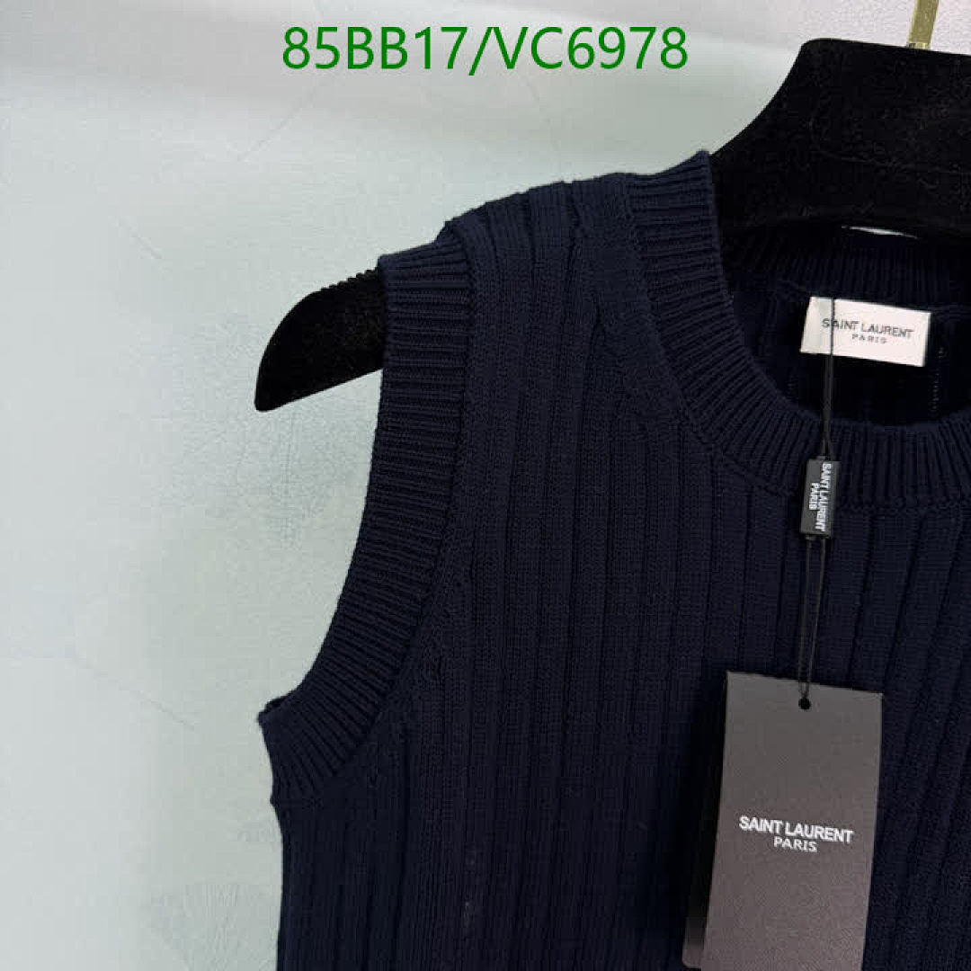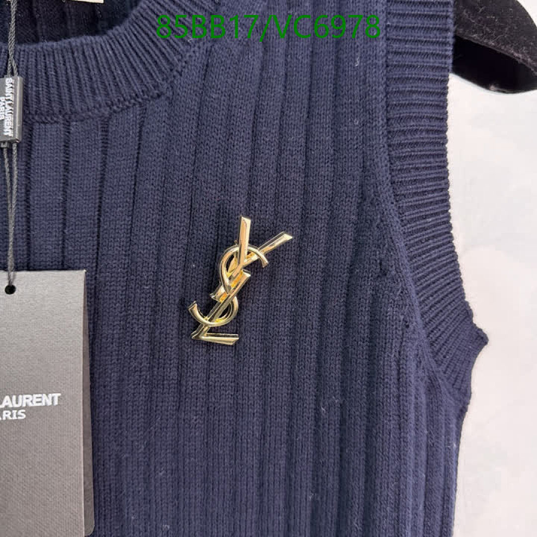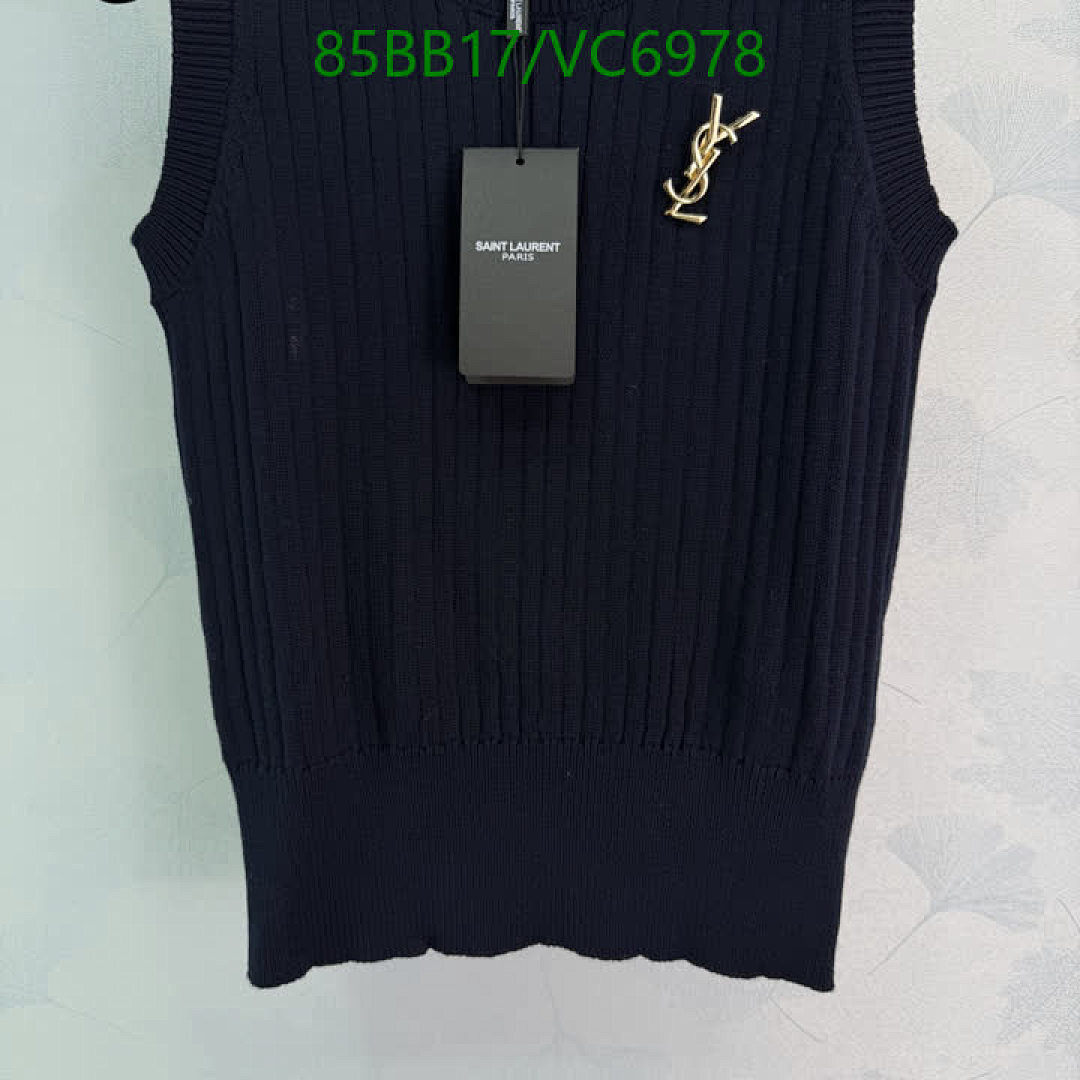 Tags: Designer Sleeveless Sweater, Luxury Knitwear Women, Ribbed Knit YSL Top, YSL Logo Pin Vest, Yves Saint Laurent Sleeveless Top